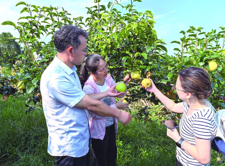 7494 次浏览 08-06涪陵农学会专家察看“翠玉”梨子长势情况7月30日,涪陵区农学会在江东街道举行高山梨子现场品鉴会,“翠玉梨”从现场4个品种中脱颖而出,表现出外观佳、甜度高、石细胞少等优势,将在涪陵高山区域有序推广。“翠