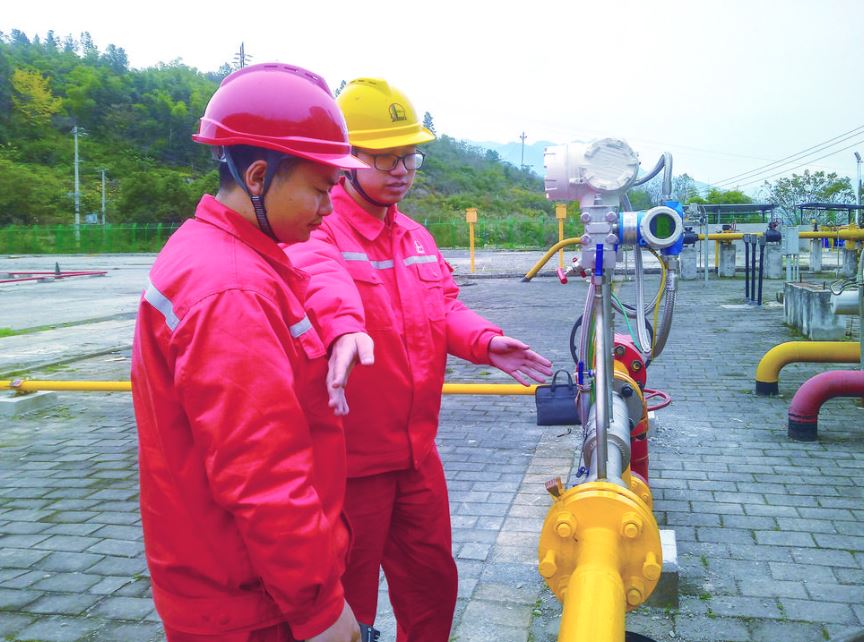 廖天奇(右)与同事在气田现场办公在涪陵页岩气公司的一间办公室里,油气藏开发助理师廖天奇的一天,通常是从一串串跳跃的数据开始的。屏幕上,来自地下数千米深处页岩气井的生产曲线、压力参数,如同这片土地深沉的